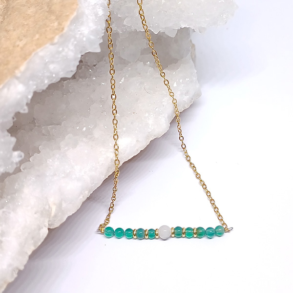 • Cada piedra es única: el brillo suave de la piedra luna y los tonos vibrantes del ágata verde reflejan la fusión entre lo visible y lo sutil.