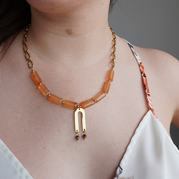 Una joya con propósito, creada para encender tu vitalidad y recordarte la fuerza que habita en tu interior. Este collar une la energía cálida y activadora de la cornalina con la protección intuitiva del ojo de tigre, formando una pieza que impulsa la acción, el coraje y el poder personal.