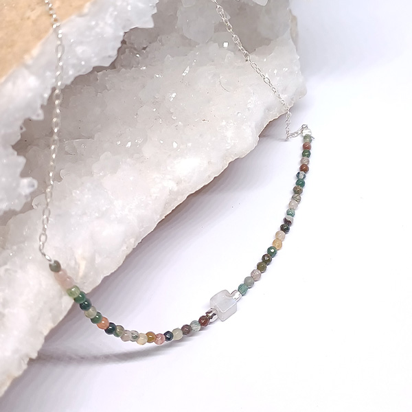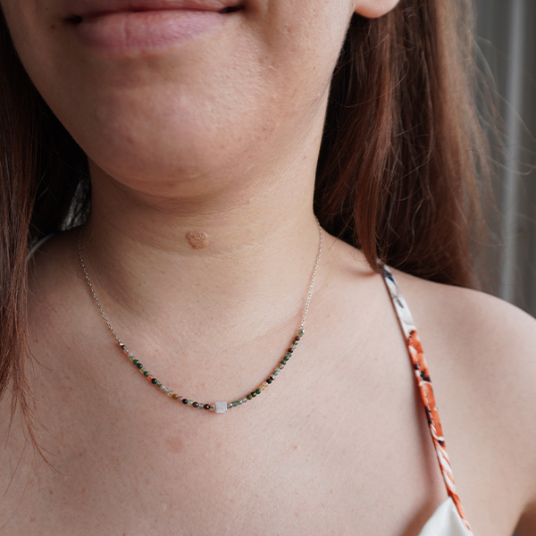 • Hecho con piedras naturales, por lo que cada collar es único: los tonos verdes orgánicos de la ágata musgosa y los destellos tornasolados de la piedra luna evocan la unión entre bosque y cielo.