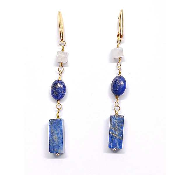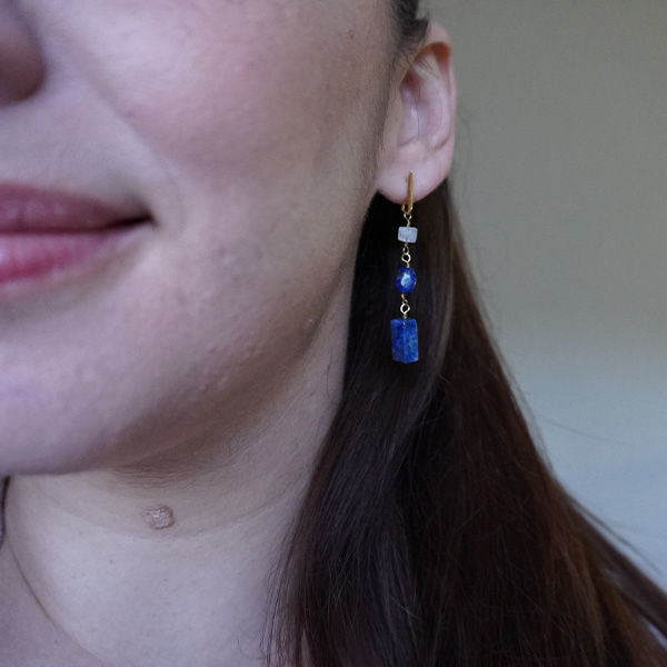 • Cada combinación de piedras es única: el azul profundo del lapislázuli, con destellos dorados de la Pirita, se une al brillo iridiscente de la piedra luna para evocar cielo, alma y misterio.