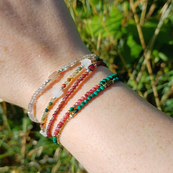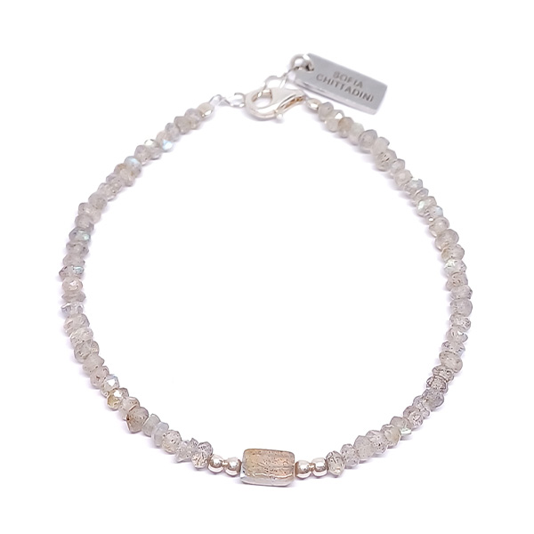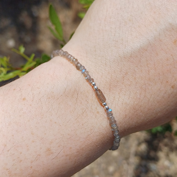• Hecha con piedras naturales, por lo que cada pulsera es única: los destellos iridiscentes de la labradorita, en tonos azules y dorados, evocan el misterio del universo reflejado en tu interior.